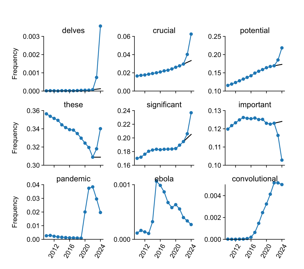 These similarities can easily bleed into your own work, making it less authentic and a lot more bland. A recent study analyzing 14 million PubMed abstracts found that the frequency of certain words like "delves," "crucial," and "notably" skyrocketed after the release of ChatGPT. This has made academic writing a lot less original.